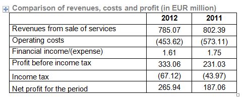 In 2012 Eustream generated revenue from the sale of services worth EUR 785.07 million, which means a drop over the previous period by EUR 17.32 million. The main source of revenues was contracted gas transmission capacities. Operating costs amounted to EUR 453.62 million, which is EUR 119.49 million down compared to 2011. The major cost items here comprised costs of services, consumption of natural gas, material and energy, and personnel costs. In 2012 Eustream recorded a profit before tax of EUR 333.06 million which was EUR 102.03 million higher than the previous year. The total income tax charge came to EUR 67.12 million.