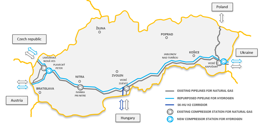 • Improving the availability of hydrogen at a favorable price and creating conditions for further development of the hydrogen network in the Central European region and Slovakia, with the aim of making the Slovak hydrogen transport network a hub for hydrogen transport in the Central European region.